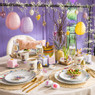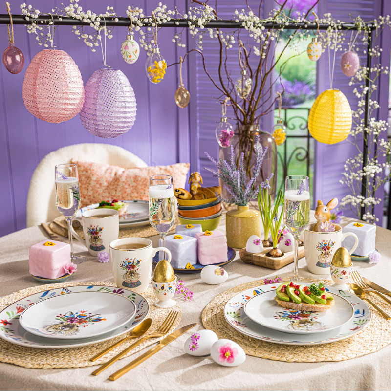 Subtiele bloemen versieren de rand van dit witte bord. Het eindresultaat lijkt op het bekende boerenbont servies, maar dan met een trendy knipoog. De gouden rand maakt het bord extra feestelijk en uitermate geschikt voor een heerlijke paasbrunch.