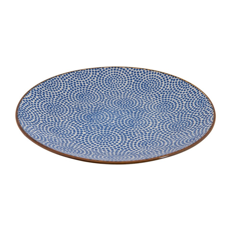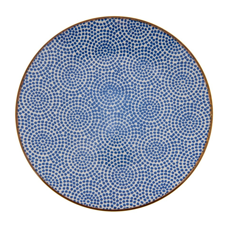 Ontbijt in stijl met dit mooie blauwe ontbijtbord. Het bord heeft een diameter van 21 cm en is gemaakt van stoneware. Dit is een erg stevig materiaal. Het bord heeft een stippen opdruk en een bruine rand. Combineer met de andere artikelen uit deze serie om er een gezellig geheel van te maken.