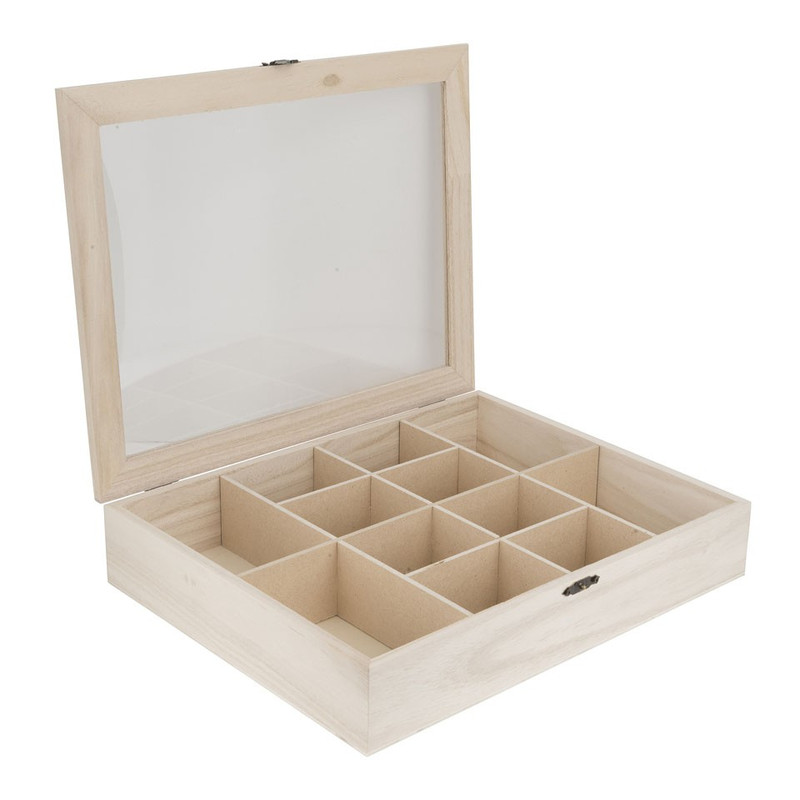 Kleine knutselspulletjes berg je eenvoudig op in deze opbergbox met 12 vakjes. Er zijn 4 grotere vakken en 8 kleine vakken. De box is gemaakt van hout en heeft een handig sluitinkje.