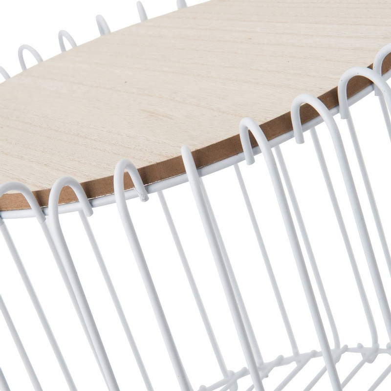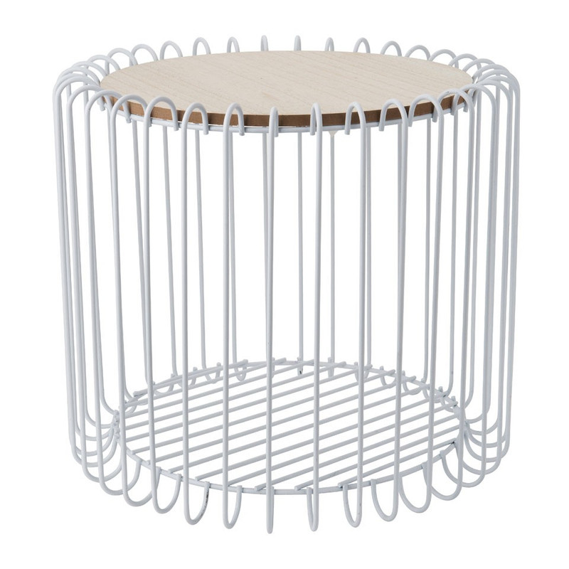Geef een stoere twist aan jouw interieur met deze industriële opbergmand Orebro. Dit exemplaar is een opbergmand en tafeltje in 1. De mand is gemaakt van metaaldraad en hout. De houtkleurige plank staat mooi op de witte mand. De hoogte van de mand is 40 cm en de diameter is 35 cm. In ons assortiment hebben we nog veel meer soortgelijke opbergmanden. Combineer er een aantal voor een speels effect!