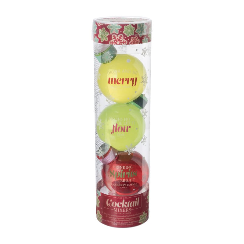 Deze ornamenten zijn niet zomaar versieringen voor in de boom. Ze zijn speciaal ontworpen om een vleugje plezier en verfrissing toe te voegen aan je kerstversiering. Elk ornament heeft de vorm van een kerstbal en is gevuld met een heerlijke alcoholvrije cocktailmix. De ornamenten komen in een set van 3.