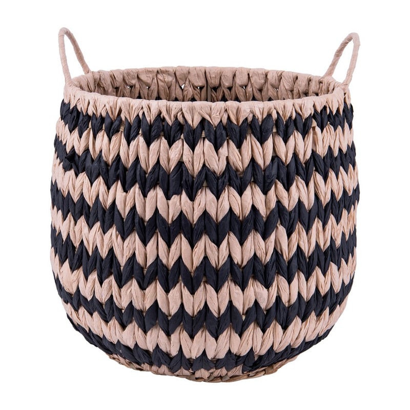 Rondslingerend speelgoed of andere spullen is verleden tijd met deze leuke mand. De mand is gemaakt van gevlochten papier, wat de mand net dat beetje extra geeft. De natuurlijke en zwarte kleur past vrijwel in ieder interieur. De hoogte van de mand is 25 cm en de diameter is 25 cm. Een ideaal formaat om bijvoorbeeld in een open kast te plaatsen. Heb je meteen een toffe eyecatcher!