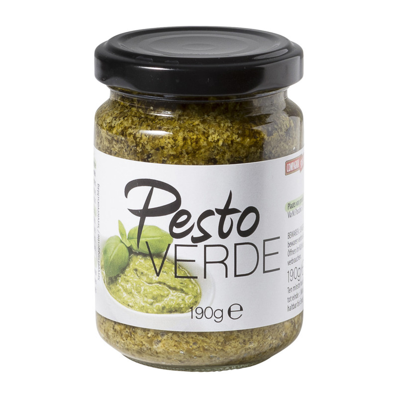 Ingrediënten: extra vergine olie, basilicum (37%), cashewnoten, grana padano kaas (koemelk, zout, stremsel, conserveermiddel: lysozyme uit ei), zout, pijnboompitten, pecorino romano kaas (schapenmelk, zout, stremsel), fructose, knoflook, aroma, zuurteregelaar: melkzuur, antioxidant: ascorbinezuur.