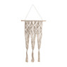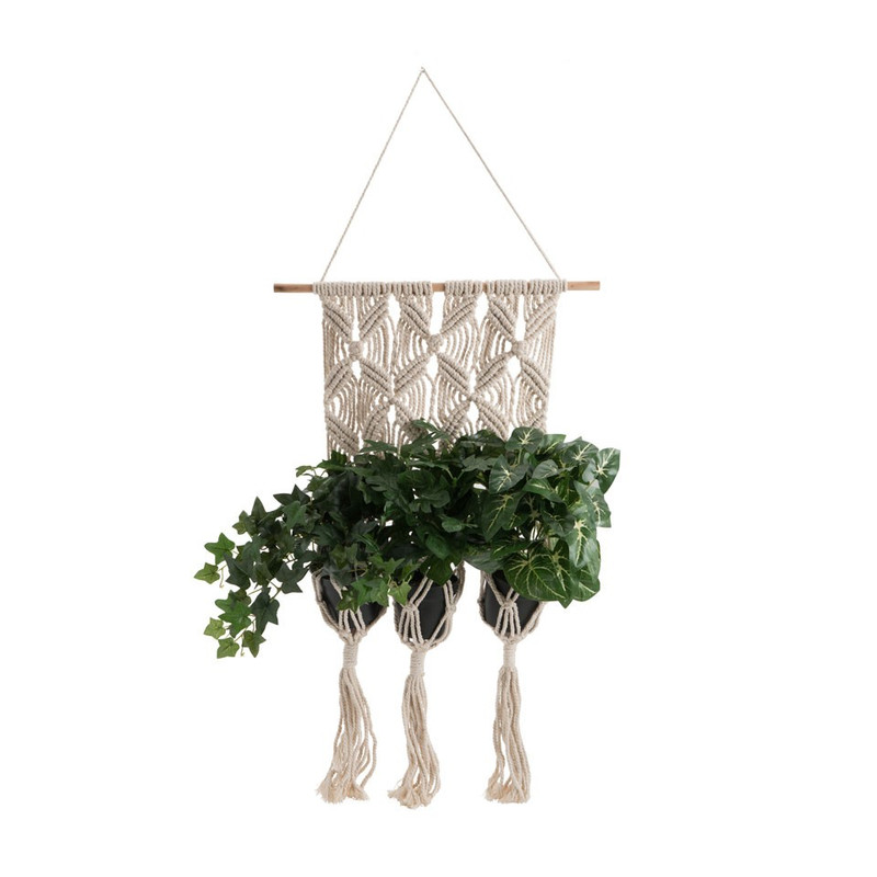 De geknoopte plantenhangers volgens de macramé techniek zijn helemaal terug van weggeweest. Een toffe woondecoratie, lekker retro! De plantenhanger is gemaakt van katoen en is 70 cm lang. Je kunt in de plantenhanger 3 kleine plantenpotjes hangen met ongeveer een diameter van 15 cm. Een aantal kleine cactussen en/of vetplantjes in potjes bijvoorbeeld. De wanddecoratie is eenvoudig op te hangen aan het touwtje dat eraan bevestigd is.