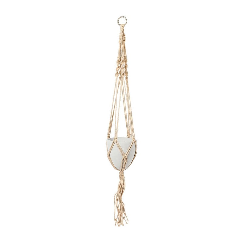 Ken je ze nog uit de jaren 70? Geknoopte plantenhangers volgens de macramé techniek zijn helemaal terug van weggeweest. Een toffe woondecoratie, lekker retro! De plantenhanger is gemaakt van jute en is een meter lang. Op de afbeelding is gebruik gemaakt van een plantenpotje met een diameter van 15 cm. Maar je kunt in de hangers ook gemakkelijk een iets kleiner of groter formaat stoppen.