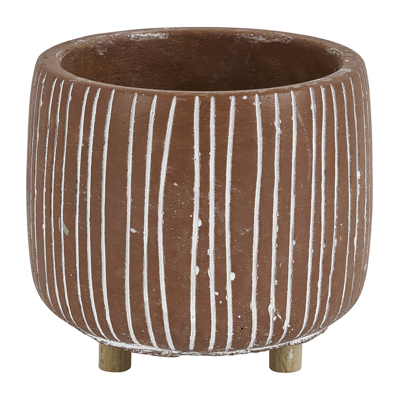 Planten en bloemen houden van leuke potjes op pootjes. Bijvoorbeeld dit vrolijke exemplaar! De plantenpot met witte streepjes rust op drie houten pootjes. Het design is eenvoudig maar speels. Zet de pot neer op de vensterbank, boven op de kast of op tafel. De pot is gemaakt van cement en daardoor erg stevig.