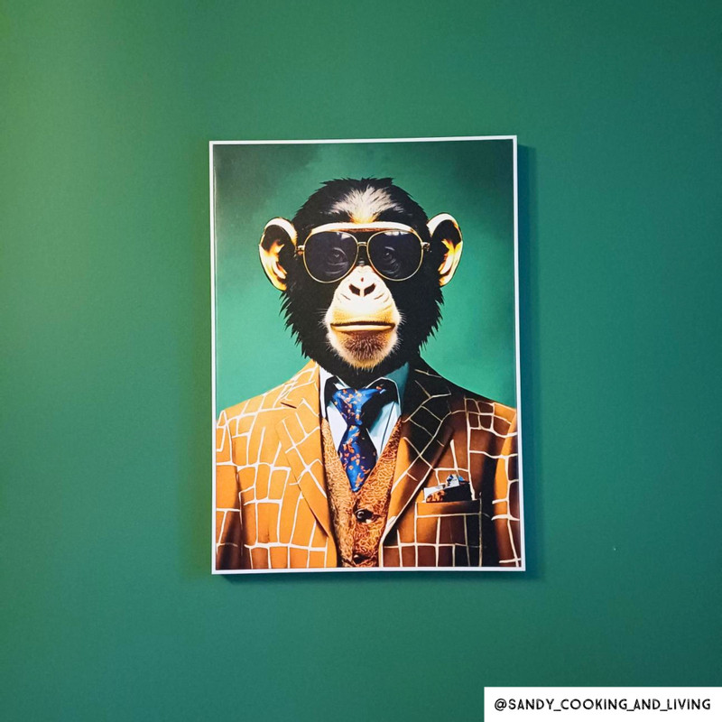 Deze stoere poster van een aap in pak met een zonnebril maakt jouw muur direct een eyecatcher. De poster heeft een groene achtergrond. Hang de poster in de woonkamer, hal, slaapkamer of een ander plekje in je interieur. De poster heeft een hoogte van 70 cm en een breedte van 50 cm.