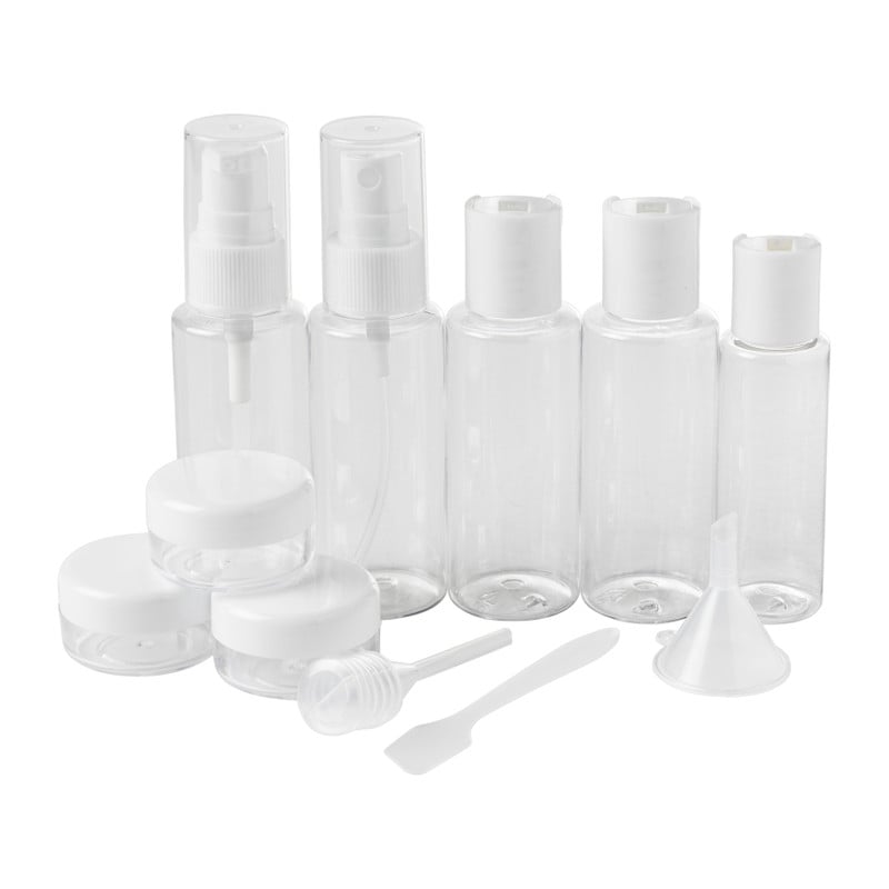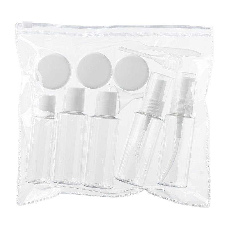 Gebruik gewoon je favoriete shampoo op vakantie door deze reisflessen te vullen. Je neemt precies de juiste hoeveelheid mee. Daardoor bespaar je ruimte en gewicht voor andere spullen of souvenirs van de reis. Er zitten verschillende flesjes en potjes in de set. Inhoud: 2 flesjes met klepsluiting, 1 flesje met spray dop, 1 flesje met pomp dop, 1 flesje met pompsluiting 2 grote potjes voor crème en 1 klein potje voor creme of zalf.