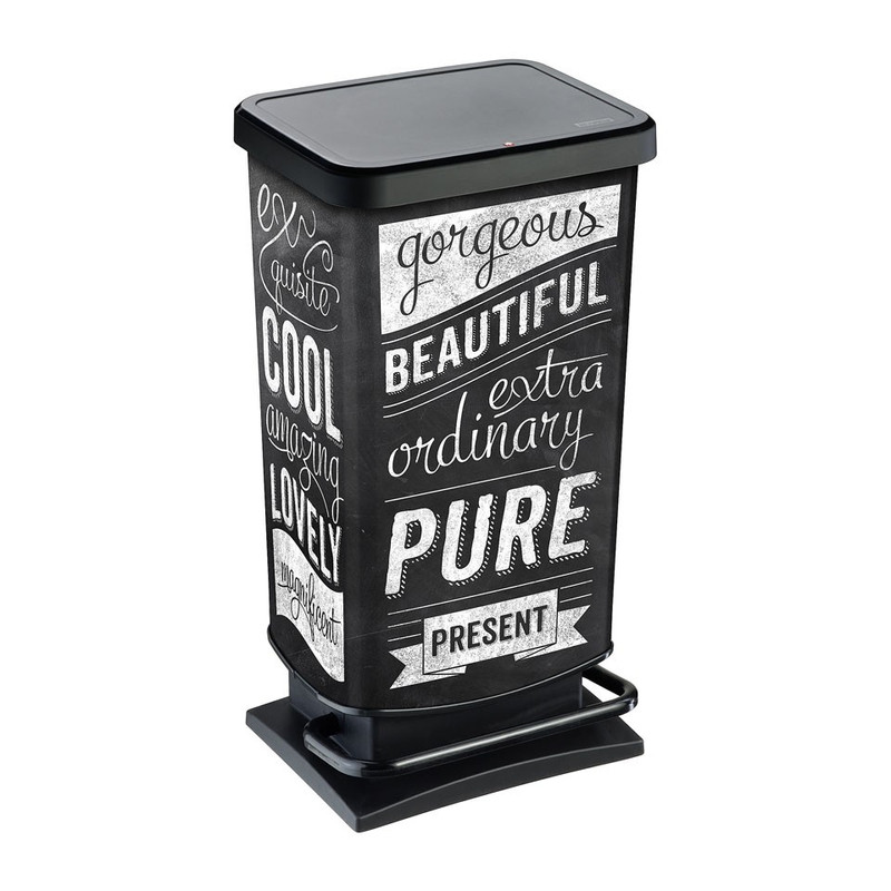 Pedaalemmer Paso hipster van het merk Rotho heeft een inhoud van 40 liter. De pedaalemmer met afneembare binnenring is dankzij zijn hippe uitstraling en grote inhoud geschikt voor ieder huishouden. De afvalbak is gemaakt van kunststof en is zwart van kleur met witte teksten/woorden.