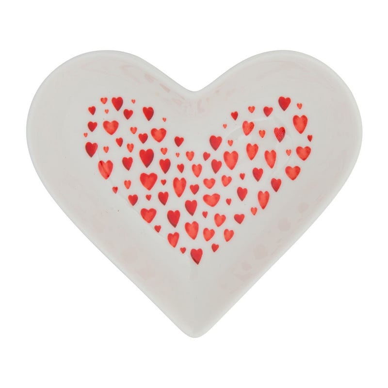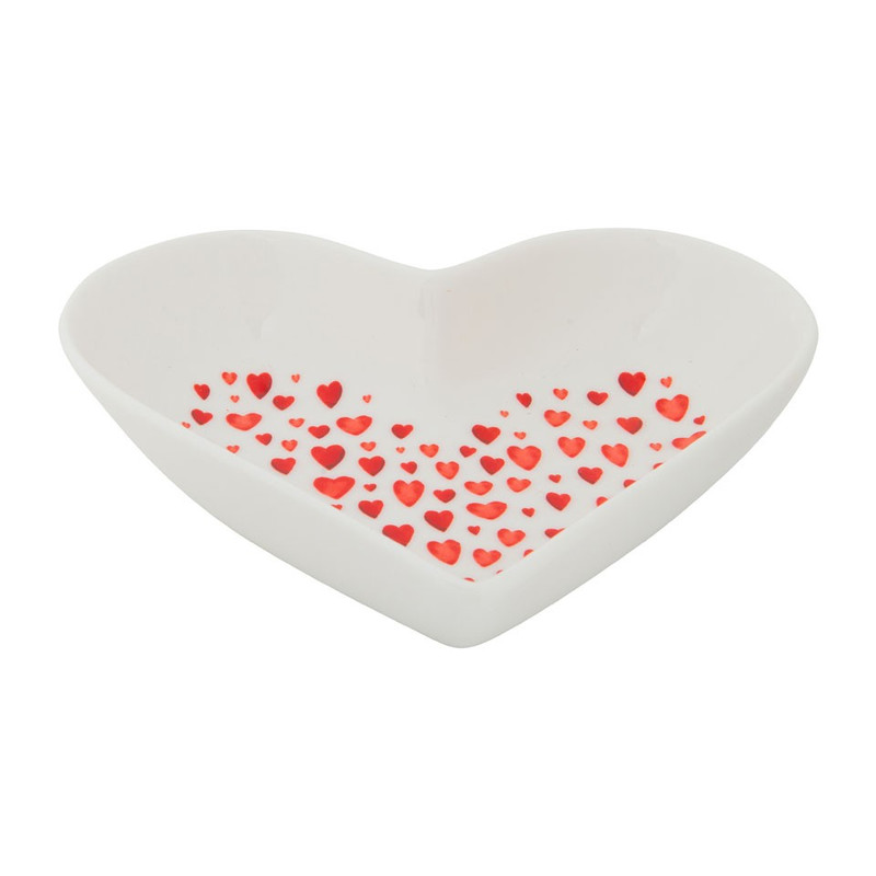 Serveer jouw met liefde gemaakte hapjes in dit schaaltje in de vorm van een hartje. Ideaal om iets lekkers in te serveren aan je gasten. Dankzij het mooie design kunnen ze ook als decoratie gebruikt worden. Het schaaltje heeft een print van kleurrijke rode hartjes.