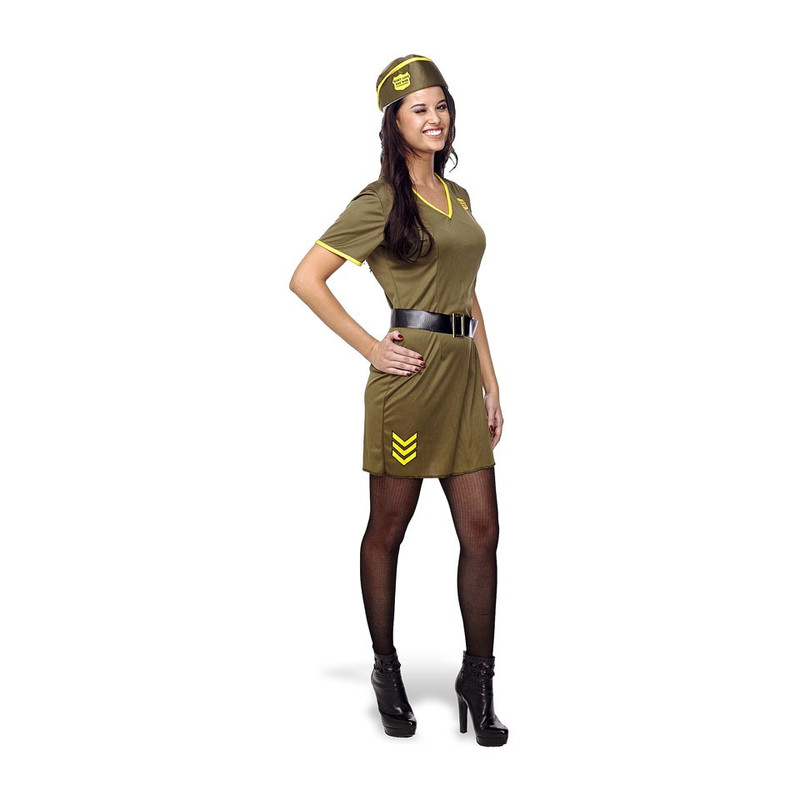 "Make love, not war" met dit sexy legeroutfit voor dames. Dit groene legerjurkje komt met een cap en een riem. Het jurkje heeft een gele rand en is voorzien van enkele grappige details.