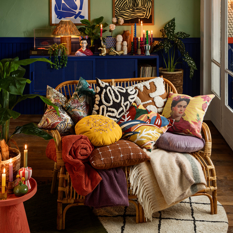 Voeg kleur toe aan je bank of fauteuil met sierkussen Frida. Het kussen is voorzien van een print van de befaamde schilderes. Mix & match dit sierkussen met andere kleurrijke accenten voor een speelse uitstraling. Laat de schitterende kleuren en artistieke flair je interieur opvrolijken en verfraaien.