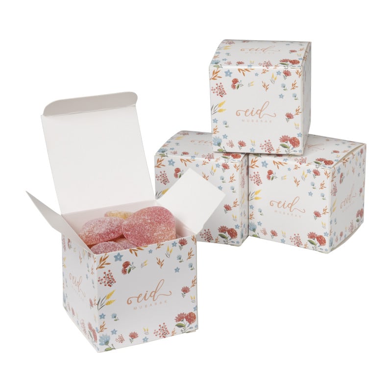 Maak Eid al-Fitr nog feestelijker met deze set van 8 Eid Mubarak snoepdoosjes! Deze snoepdoosjes hebben een hoogte van 6.5 cm, een breedte van 6.5 en een breedte van 6.5 cm en zijn gemaakt van stevig papier. Het snoepdoosje is versierd met bloemen in vrolijke kleuren en met de feestelijke groet 'Eid Mubarak' in het midden.