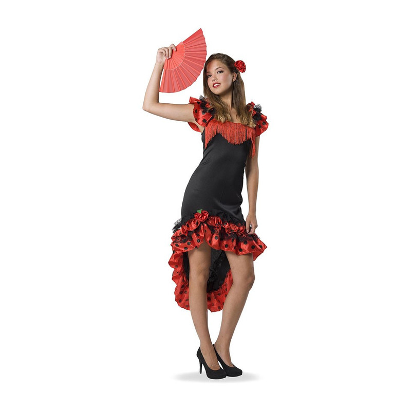 Met deze Spaanse Flamenco jurk ben je klaar voor een zinderende avond! Deze zwarte jurk heeft opvallende rode accenten en komt met bijpassende een rode roos voor in je haar. In deze jurk kom je zeker jouw matador tegen.
