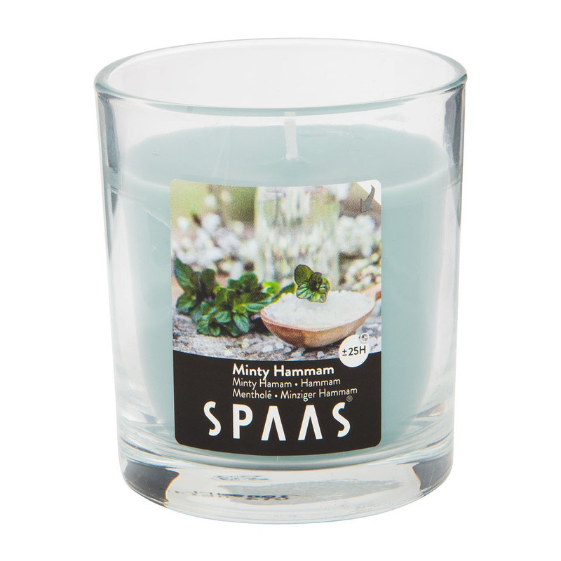 Een knusse sfeer creëren en tegelijkertijd een heerlijke geur in huis? Dat kan met deze geurkaars van Spaas met de geur Minty Hammam. De kaars heeft een brandtijd van ongeveer 25 uur. Het glas is 7.5 centimeter hoog en heeft een diameter dan 6.5 cemtimeter.
