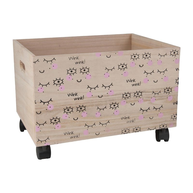 Houten speelgoed kist op wielen met vroljijke print van open, gesloten en knip- oogjes. Heb je last van rondslingerend speelgoed? Met deze handige houten speelgoedkisten op wielen berg je al het speelgoed netjes op. Wordt de kist een beetje zwaar dan rol je deze gewoon van de ene plek naar de andere plek. Staat de kist op zijn plek dan kun je de wieltjes blokkeren. Super handig! Deze houten kist is 40 breed, 30 cm en 28 cm hoog (inclusief wielen) en is ook verkrijgbaar in een groter formaat. Bekijk ze allemaal op Xenos.nl