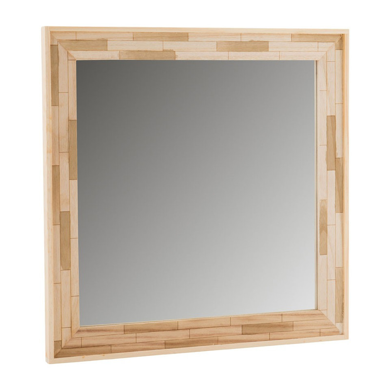 Deze vierkante spiegel is voorzien van een diepe lijst met houtblokjes. De spiegel heeft een afmeting van 48x48 cm en is eenvoudig op te hangen aan de haakjes op de achterzijde.