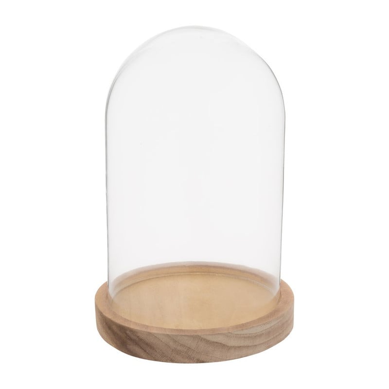 Deze stolp staat op een houten plateau. Erg leuk om te gebruiken ter decoratie in huis. Je kunt er allerlei items in doen zoals bloemen of seizoensgebonden accessoires. Zo heb je iedere keer weer iets nieuws!