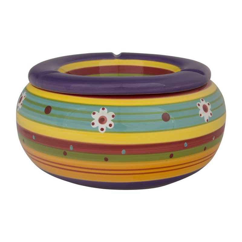 Deze mega grote stormasbak is ideaal om buiten neer te zetten. Handig wanneer je een feestje hebt waar veel gerookt wordt bijvoorbeeld. Dit exemplaar is gemaakt van aardewerk en heeft een erg vrolijke opdruk met allerlei kleurtjes. De bovenste rand is paars en er zitten drie uitsparingen in waar je een sigaret op kunt leggen.