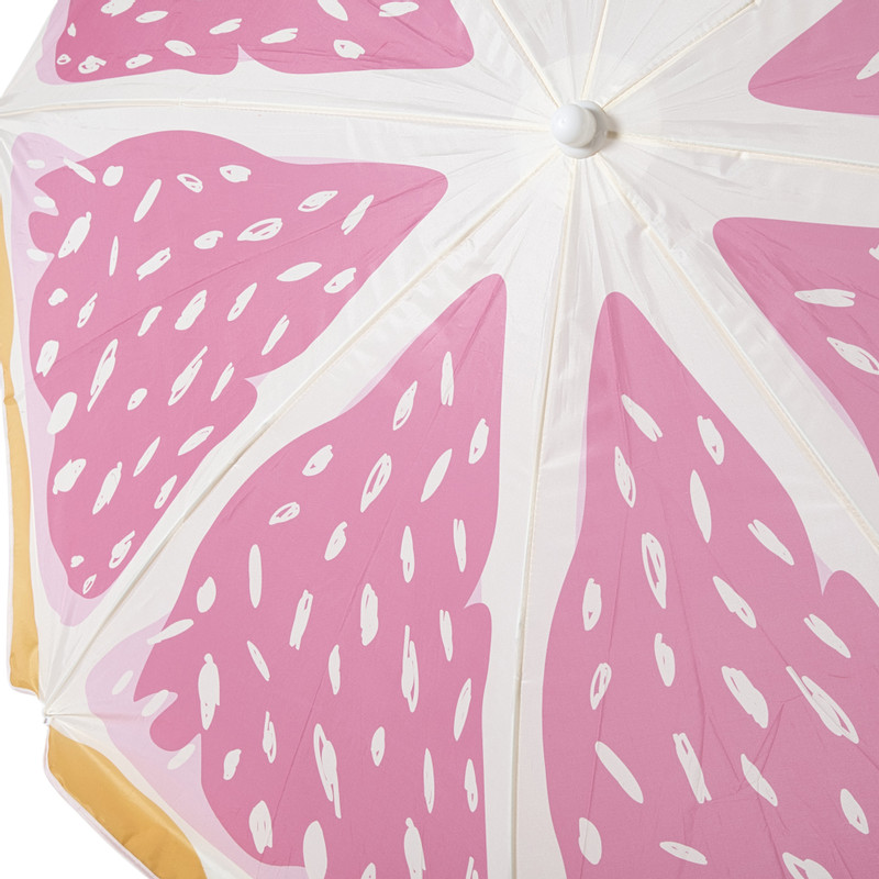 Met deze roze/oranje strandparasol zit je altijd goed in de schaduw. De vrolijke kleuren maken ‘m ideaal voor een zonnige stranddag of een zomers tuinmoment.