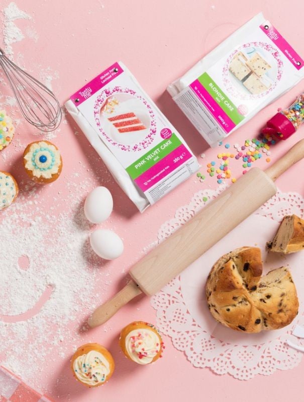 Ingrediënten: Suikerpoeder, Water, Aardappelzetmeel, Zonnebloemolie met een hoog oliezuurgehalte, Rijstmeel, Aroma, Kleurstoffen: E133, E110*, E100, E122*.