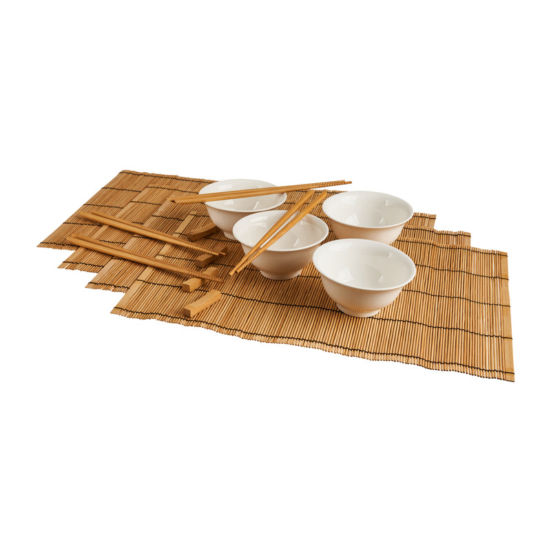 Of je nu sushi gaat afhalen of zelf aan de slag gaat in de keuken. In de handige set zit alles wat je nodigt hebt voor het eten van jouw favoriete Japanse maaltijd! De sushi set bestaat uit kommetjes, bamboe placemats, eetstokjes en houders voor de stokjes. Leuk als cadeau voor een vriend(in) of voor jezelf!