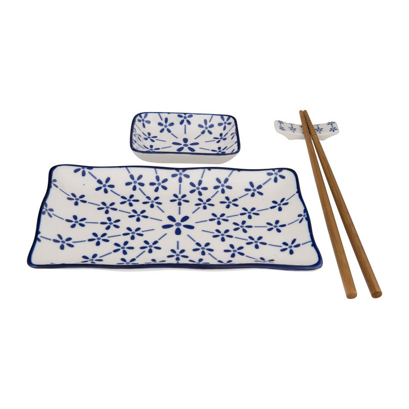Sushi in stijl! Deze leuke sushi set met bloemdesign is onmisbaar als je sushi gaat eten. De set bestaat uit een bordje om de sushi’s in te leggen, een schaaltje voor de sojasaus, twee bamboe chopsticks (eetstokjes) en een houdertje voor je chopsticks. De sushiset is gemaakt van hoogwaardig porselein en mooi afgewerkt. Superdeluxe op tafel. * Hoogwaardig porselein * Geschikt voor vaatwasser en magnetron * Mooi bloem design * Afmeting schaal 19 x 12 x 2 cm (lxbxh) * Afmeting sojaschaaltje 9,5 x 6,5 x 2 cm (lxbxh)