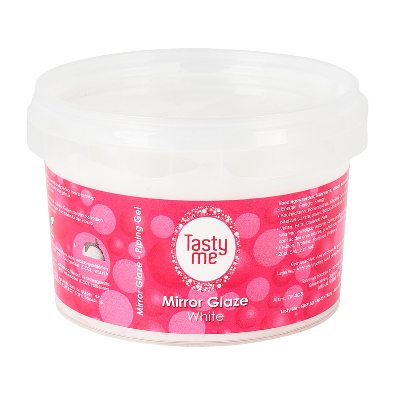 Oeh, een glazuurlaagje maakt jouw donut of taart extra lekker en mooi! Deze kant-en-klare glazuur gel van Tasty Me smeer je eenvoudig en snel op jouw gebak. De gel is van wit van kleur, maar met voedselkleurstoffen is het in iedere gewenste kleur te mengen. Wil je een spiegeltaart maken? Verdun het glazuur met maximaal 10% water.