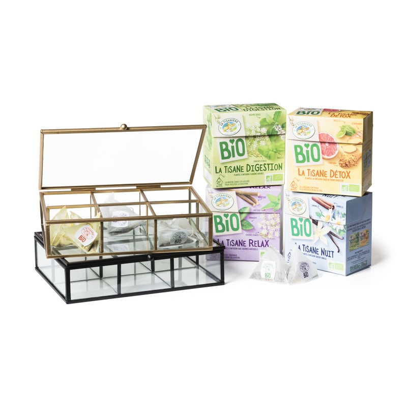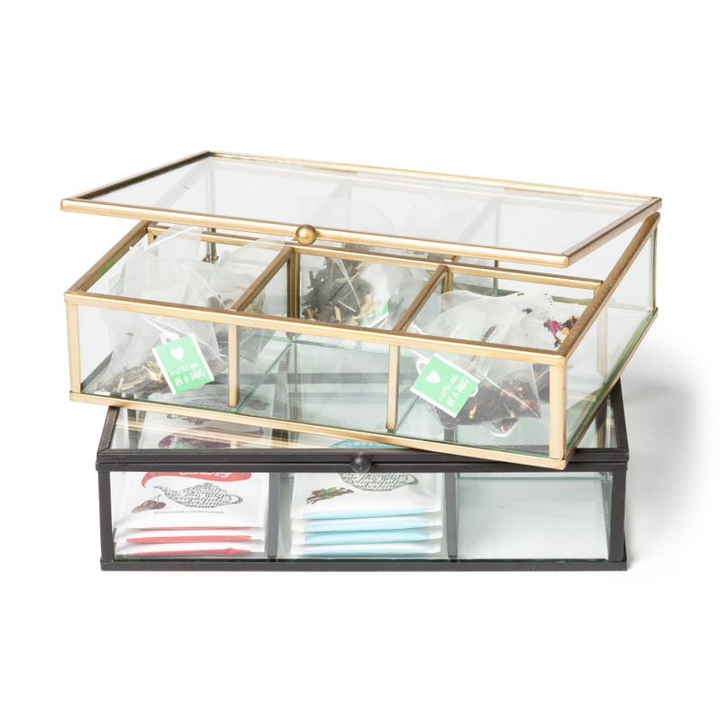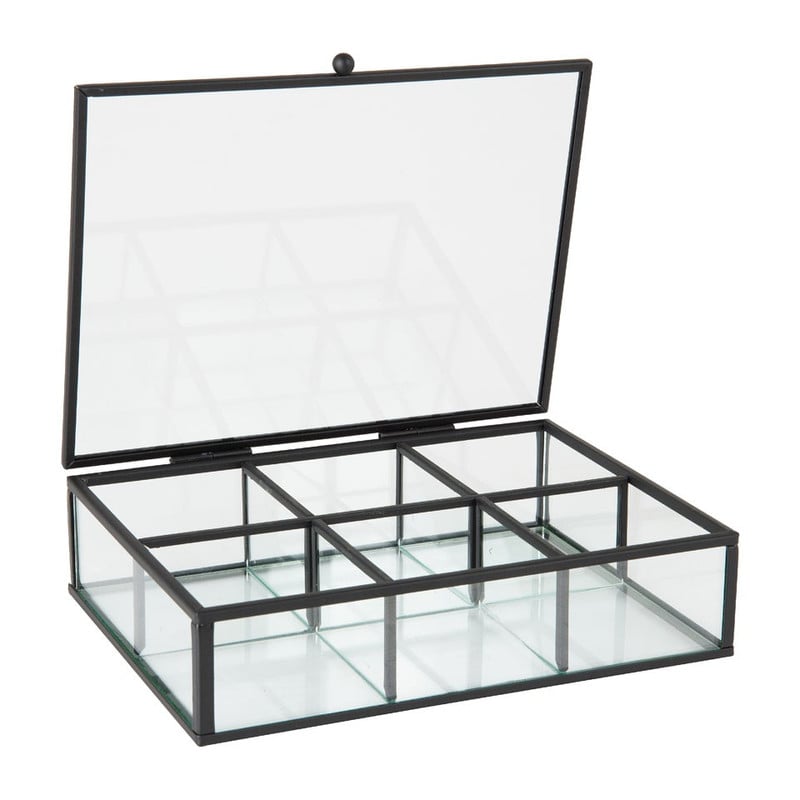 Deze theedoos gemaakt van glas en metaal past pefect in een industriëel interieur. Bewaar jouw favoriete theezakjes in dit leuke exemplaar. Er zitten 6 vakjes in deze theedoos. Zo kun je alle thee-smaken goed ordenen. De afmeting van de theebox is 20x15x5 cm.