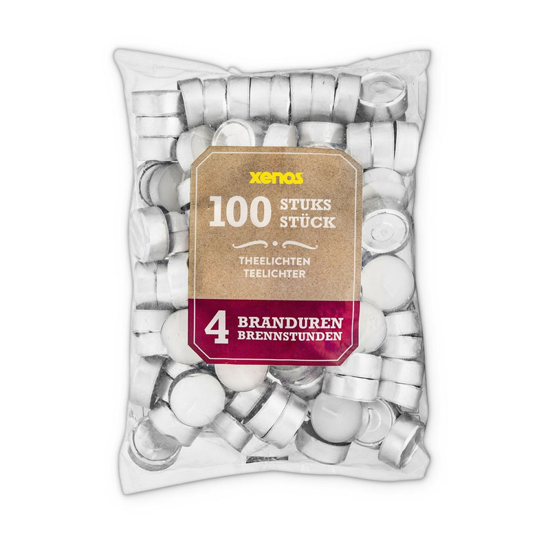 Een zak theelichtjes is altijd handig om in huis te hebben. Het is heerlijk om ’s avonds kaarsjes aan te steken en er een gezellige avond van te maken. Deze theelichten branden 4 uur lang en er zitten 100 stuks in de zak. Daarmee kan je heel wat avondjes bij fijn kaarslicht zitten. * Verpakt per 100 stuks * Let op de veiligheid als je een kaars brandt