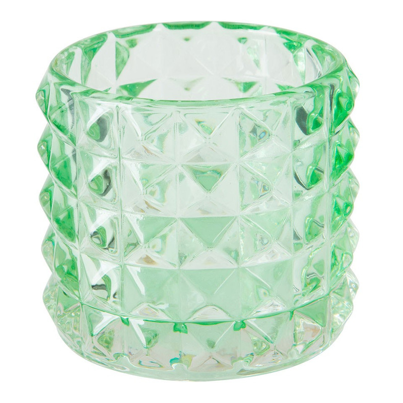 Steek 's avonds gezellig een kaarsje aan in deze lichtgroene theelichthouder. Het blokjes patroon maakt dit exemplaar speciaal. De theelichthouder heeft een diameter van 7.5 cm en een hoogte van 6.5 cm. Combineer met andere kleuren uit deze serie voor een mooi geheel. Zet deze bijvoorbeeld op een kaarsenplateau of in een groepje bij elkaar op de dressoir.