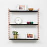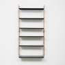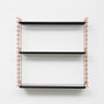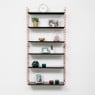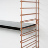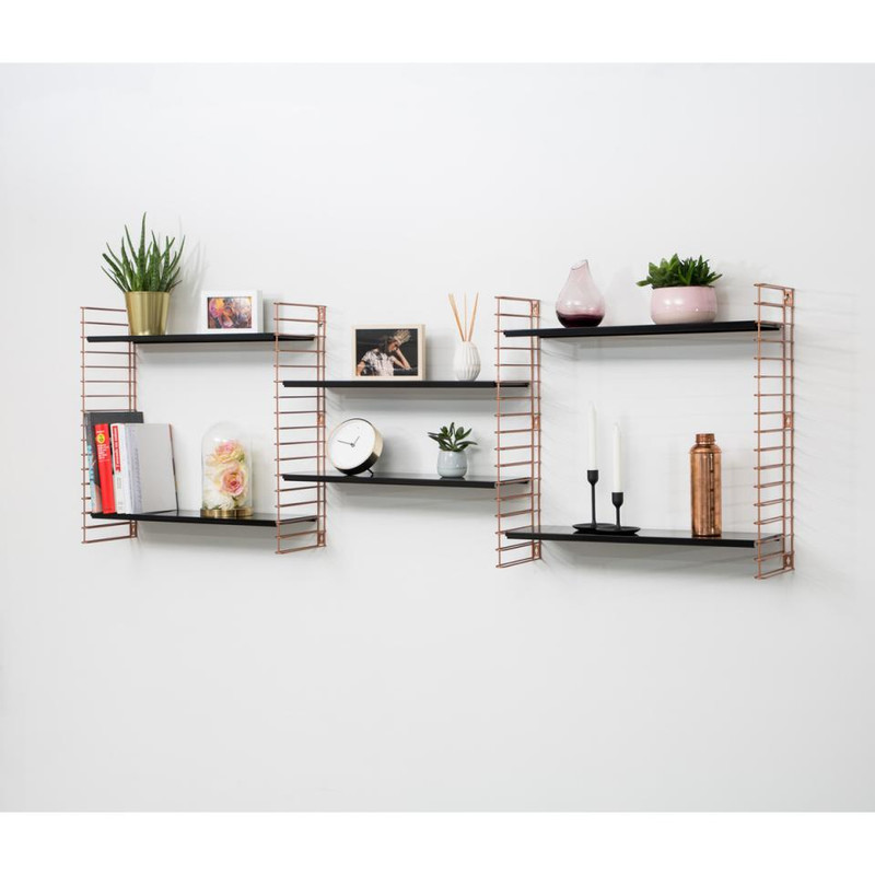 Het Tomado boekenrek heeft een originele vormgeving met 3 verstelbare stalen planken. De basisafmetingen zijn 70x21x68 cm maar dit rek is gemakkelijk horizontaal of verticaal uit te breiden. De zwarte planken en koperkleurige zijsteunen zijn in metaal en kunnen elk tot 8 kg dragen. Eenvoudige wandmontage. Original design: Adriaan Dekker 1958.