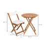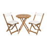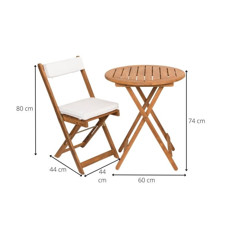De tuinset is een 3-delige set en bestaat uit twee stoelen en één tafel. De tafel heeft een diameter van 60 cm en een hoogte van 74 cm. De stoelen hebben een lengte van 44 cm, een breedte van 44 cm en een hoogte van 80 cm.