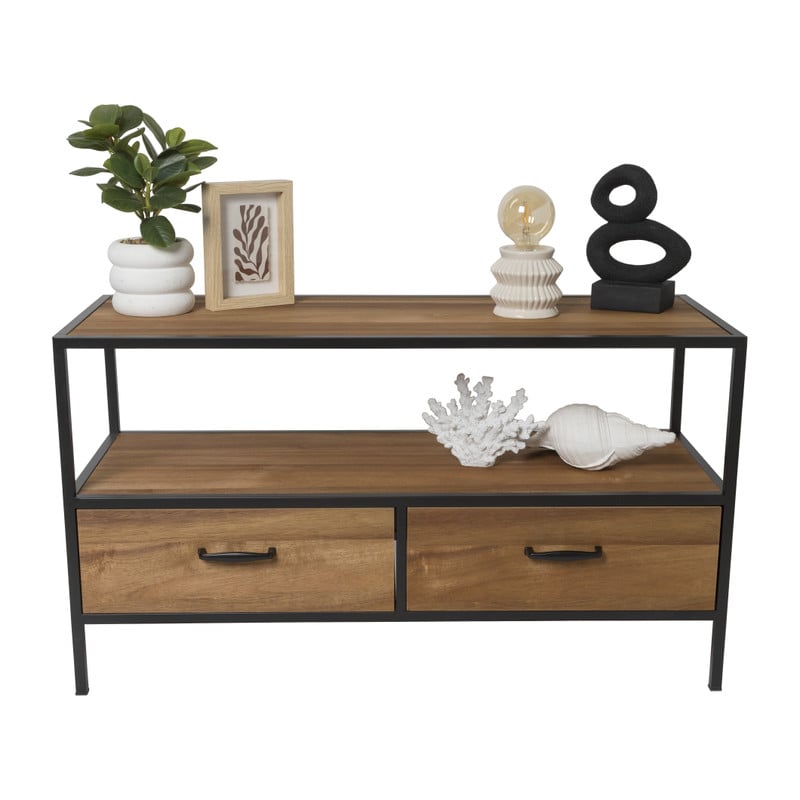 Dit tv meubel is gemaakt van metaal en MDF, wat zorgt voor een een industriële uitstraling. Het tv meubel heeft 2 laden.