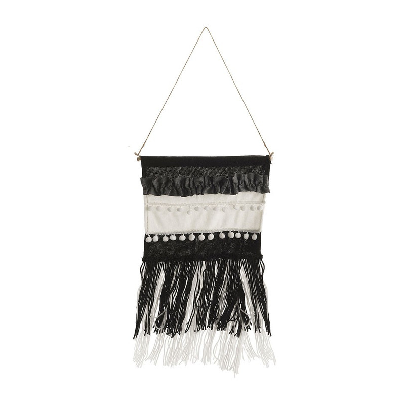 Dit vaantje is een prachtige decoratie in de hal, woonkamer of slaapkamer. Dit exemplaar is gemaakt van polyester en heeft de kleuren zwart, wit en een beetje grijs. Dankzij het touw aan de bovenkant kun je deze makkelijk ophangen aan een spijker.