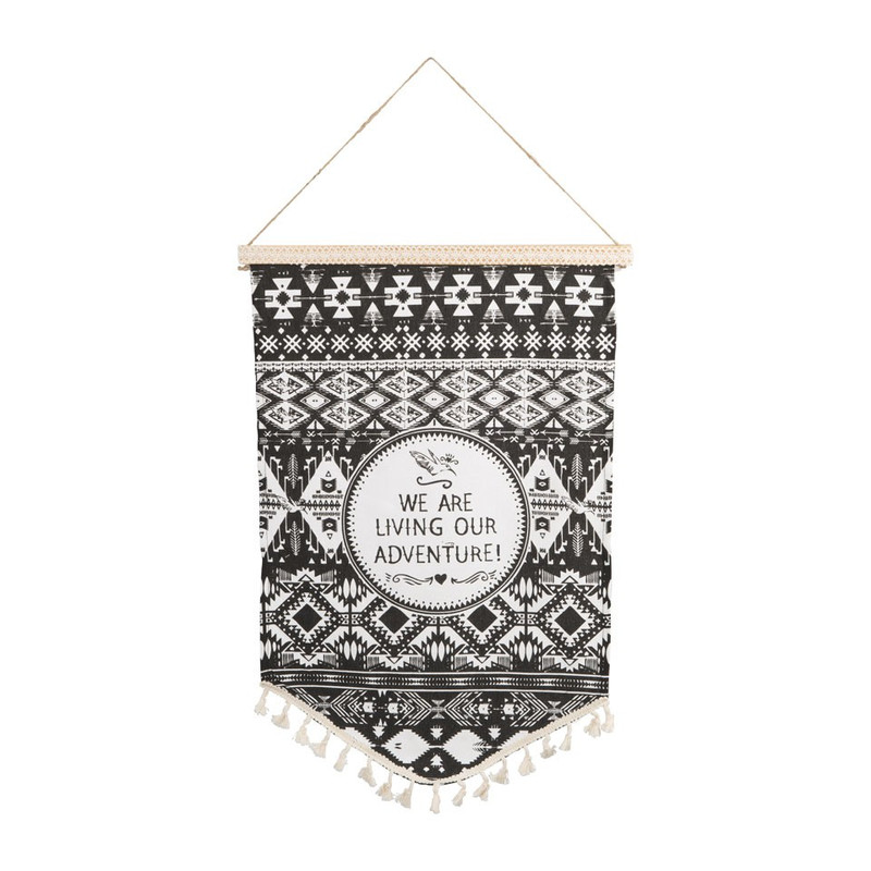 Mooie grote vaan in zwart-wit om de kamer mee te versieren. In het midden staat de tekst 'We are living our adventure!'. Ideaal wanneer je een echte avonturier bent dus. Onderaan dit vaantje hangen crèmekleurige klosjes. Je kunt dit exemplaar gemakkelijk ophangen aan een haakje of spijker dankzij het touwtje aan de bovenkant.