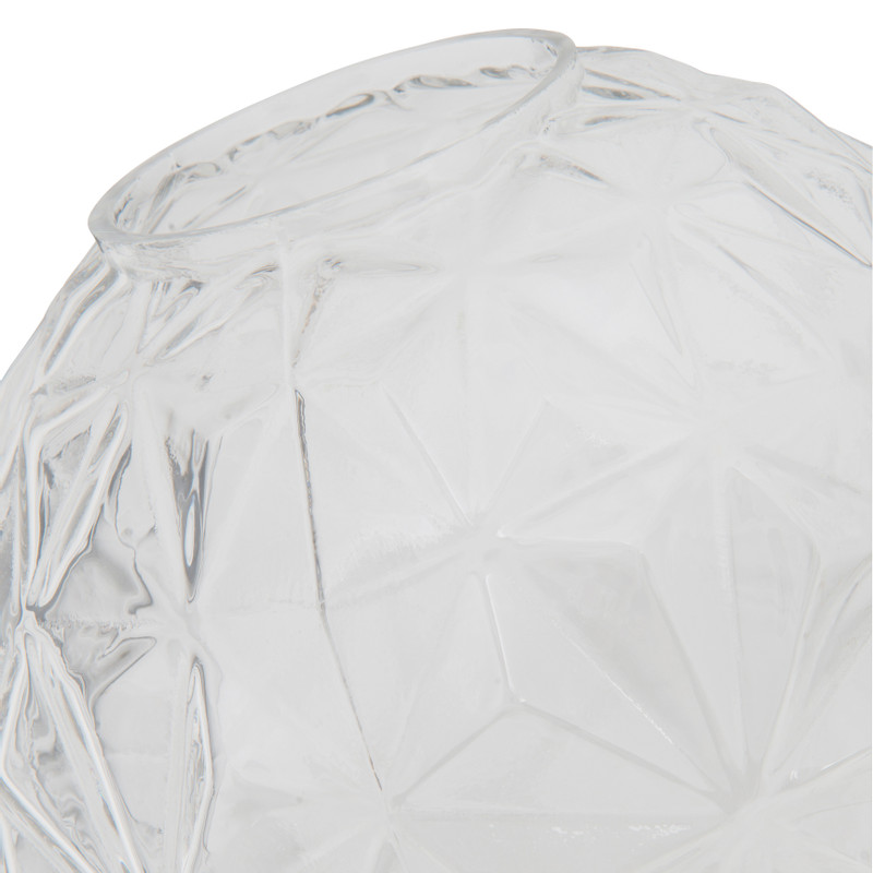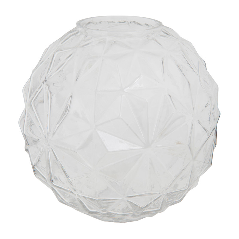 Decoreer je huis met deze bolvormige vaas, gemaakt van glas. Deze vaas heeft een hoekig reliëf wat zorgt voor een moderne uitstraling. Vul deze vaas met takken of bloemen of kies er voor om de vaas leeg te laten en te laten optreden als decoratiestuk op zich. De vaas is gemaakt van helder glas.