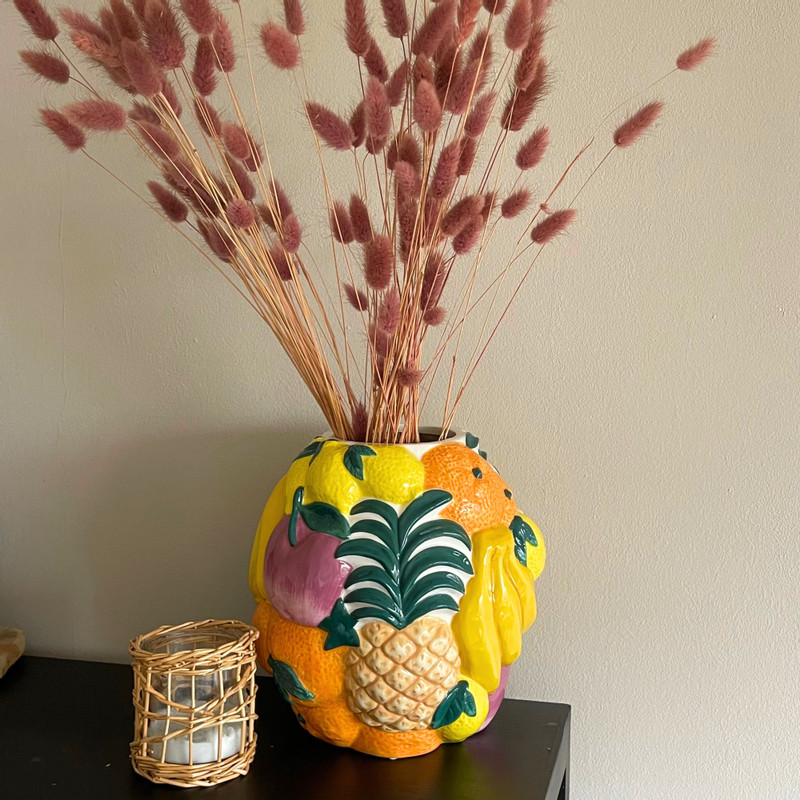 Deze fruitige vaas is een feest voor het oog! Met zijn speelse kleuren en vrolijke design brengt hij direct een zomers gevoel in huis. Perfect voor een bos bloemen of gewoon als decoratief statementstuk. Of je hem nu in de keuken, woonkamer of eetkamer zet, deze vaas zorgt altijd voor een frisse en vrolijke uitstraling!
