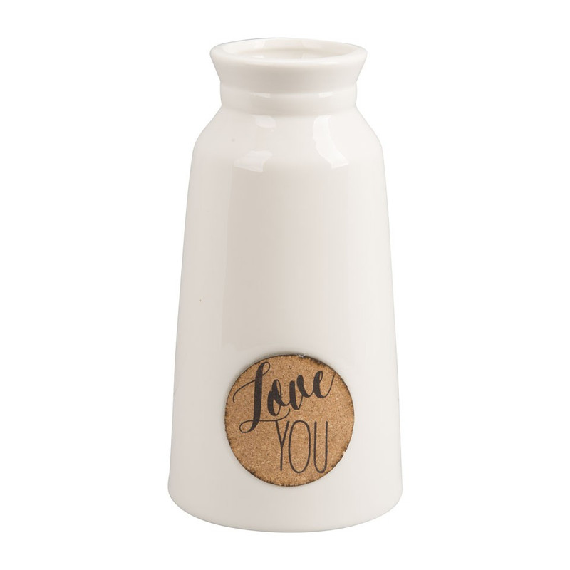 Deze vaas is gemaakt van keramiek en erg mooi ter decoratie of met een bloemetje erin. De vaas is wit met een rond vlak van kurk met daarin de tekst 'Love You'. De hoogte van deze siervaas is 18.5 cm.