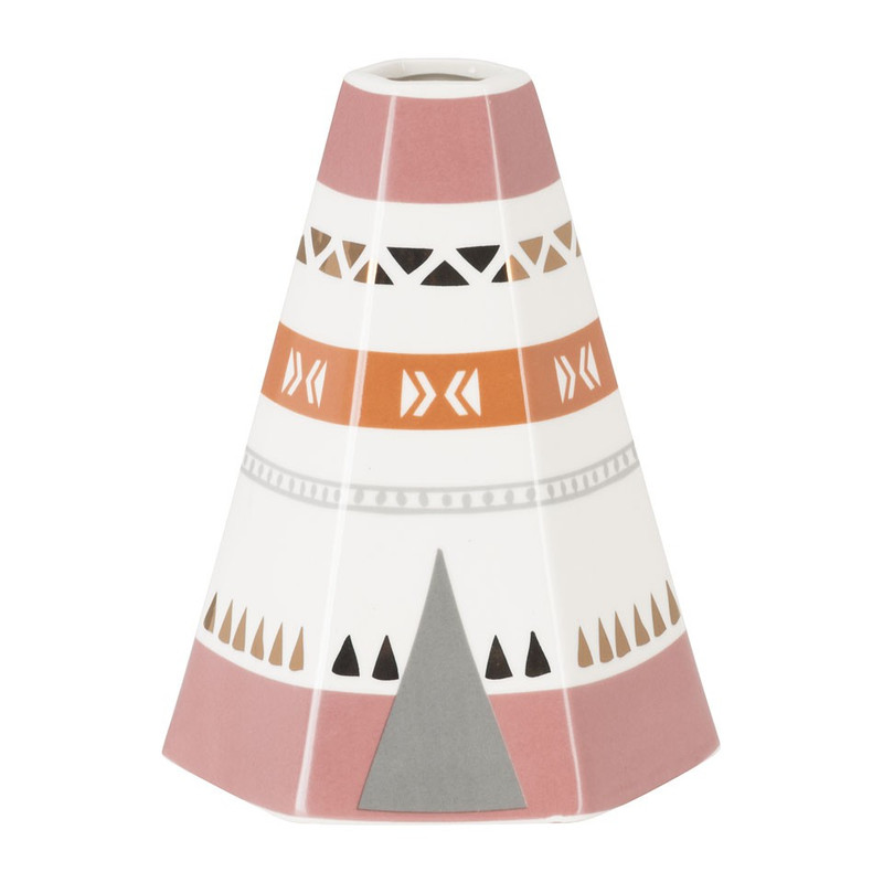 Een vaas is meer dan een omhulsel voor vazen, de juiste vaas geeft namelijk sfeer. Deze vaas in de vorm van een tipi tent is een mooie zomerse toevoeging aan jouw interieur. Zelfs zonder bloemen erin! De vaas is 15 cm en hoog en is gemaakt van keramiek. combineer de vaas met het wat grotere exemplaar en de houten tipi tent voor een speels geheel.
