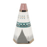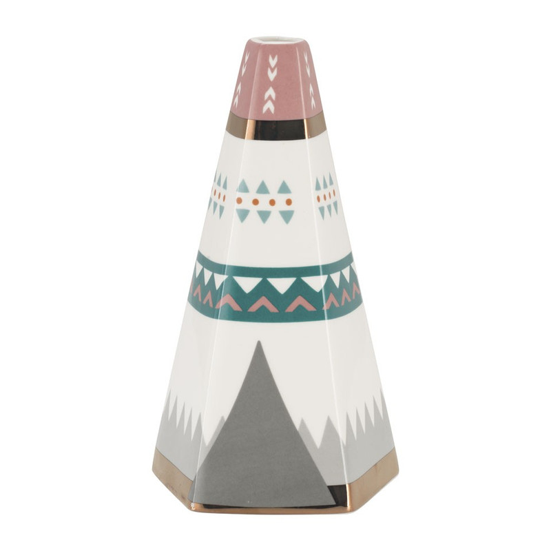 Een vaas is meer dan een omhulsel voor vazen, de juiste vaas geeft namelijk sfeer. Deze vaas in de vorm van een tipi tent is een mooie zomerse toevoeging aan jouw interieur. Zelfs zonder bloemen erin! De vaas is 20 cm en hoog en is gemaakt van keramiek. combineer de vaas met het wat grotere exemplaar en de houten tipi tent voor een speels geheel.