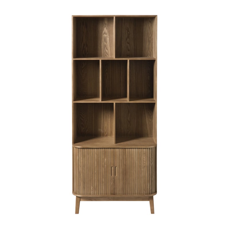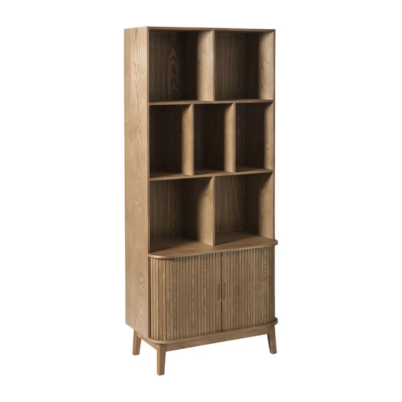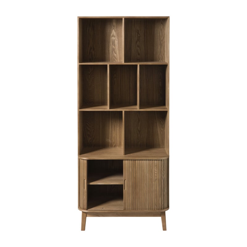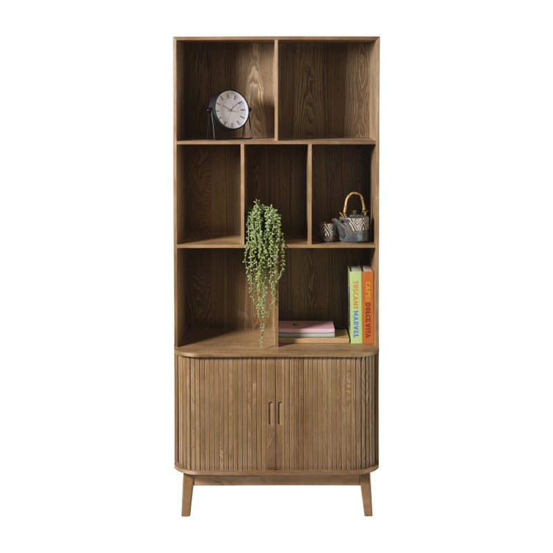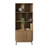 Deze vakkenkast is een echte eyecatcher! De open vakken zijn ideaal om je mooiste woonaccessoires, boeken of planten in uit te stallen. De strakke lijnen en natuurlijke houtlook maken deze kast tot een tijdloos meubelstuk dat sfeer brengt in elke ruimte: van woonkamer tot werkplek. Onderin vind je twee greeploze deurtjes met een zachte sluiting. Handig voor alles wat je liever uit het zicht houdt: van administratie tot kaarsen, kabels of servies. Dankzij het slanke, hoge ontwerp neemt de kast weinig vloerruimte in beslag, maar biedt hij wél veel opbergplek. Zet hem in de woonkamer als stijlvolle boekenkast, in de eetkamer voor servies of in je home office als praktische organizer.