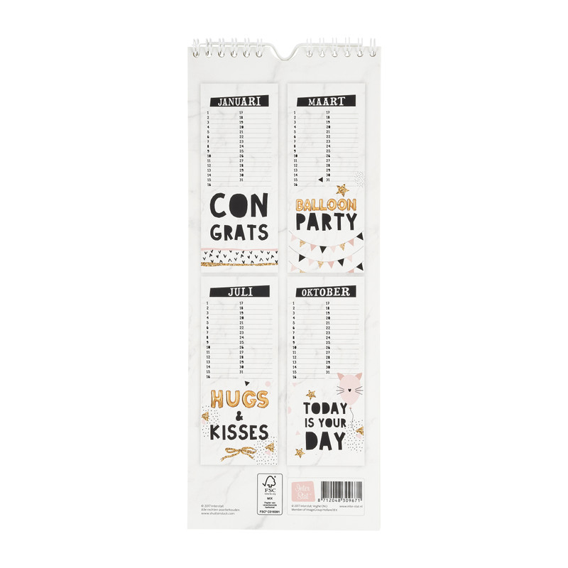 Schrijf alle verjaardagen van je vrienden en familie op deze verjaardagskalender en vergeet hen nooit meer te feliciteren. De kalender heeft voor elke maand een eigen pagina en heeft een haakje om hem gemakkelijk op te hangen.