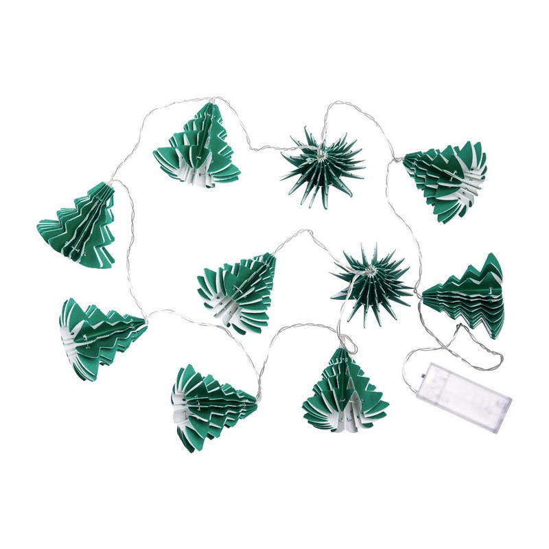 Tijdens de donkere dagen is er niks leuker dan gezellige verlichting. Dit lichtsnoer heeft tien papieren kerstbomen met lampjes erin. Het snoer is totaal 165 cm lang en heeft tien lampjes. Exclusief batterijen (2x AA)