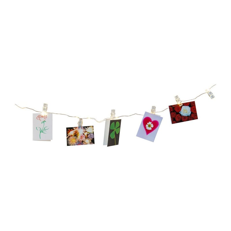 Maak van je kamer een sfeervolle ruimte door kaarten of foto's op te hangen aan deze lichtslinger met knijpers. Leuk om je woonkamer, hal of slaapkamer mee te verlichten tijdens de donkere, koude wintermaanden. De lichtslinger met knijpers is ideaal om op te hangen en mooie kaarten of foto's aan te hangen. Onze verlichtingssnoeren zijn in diverse soorten en maten verkrijgbaar. Deze snoer is ruim 190 cm lang en heeft 20 led-lampjes. De lampjes werken op 2 AA batterijen, dus je hebt geen stopcontact nodig. Handig!