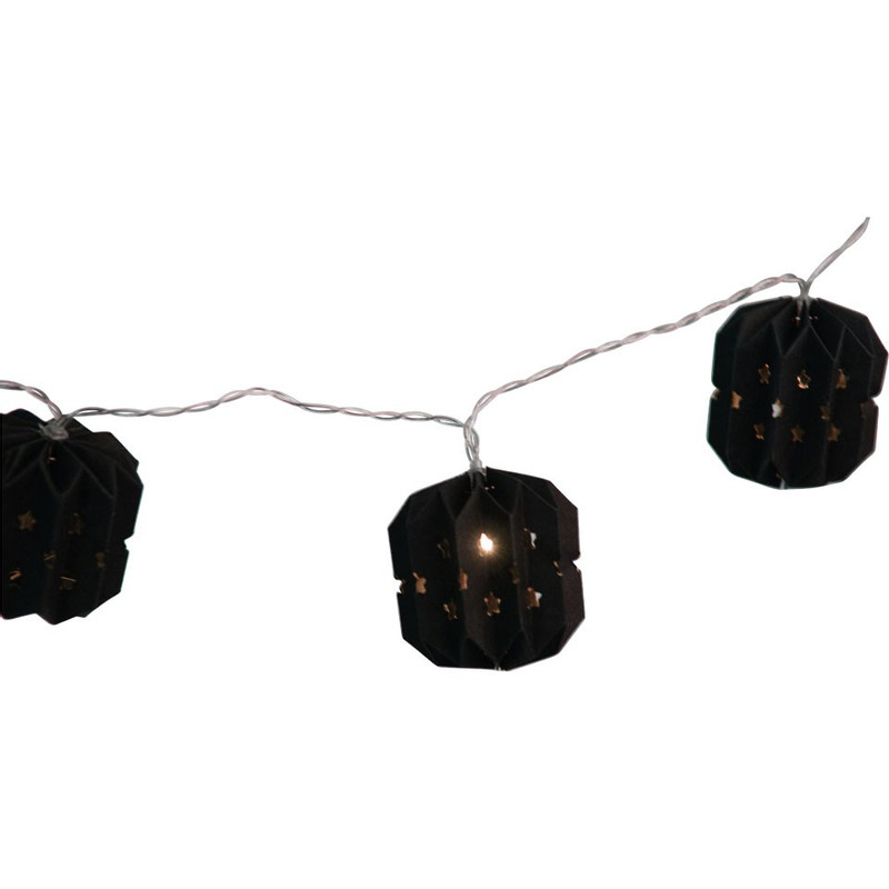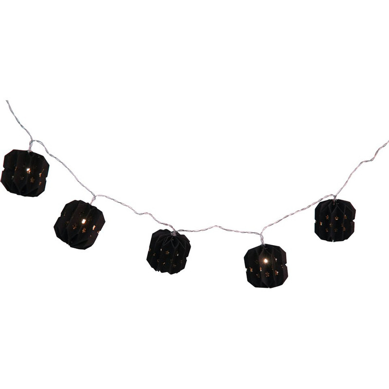 Deze zwarte papieren lichtslinger met sterretjes voegt sfeer toe aan elke ruimte. Leuk om je woonkamer, hal of slaapkamer mee te verlichten tijdens de donkere, koude wintermaanden. De lichtslinger is mooi om op te hangen, een grote glazen pot mee te vullen of een dressoir mee te versieren. Onze verlichtingssnoeren zijn in diverse soorten en maten verkrijgbaar. Deze snoer is ruim 105 cm lang en heeft 8 led-lampjes. De lampjes werken op 2 AA batterijen, dus je hebt geen stopcontact nodig. Handig!