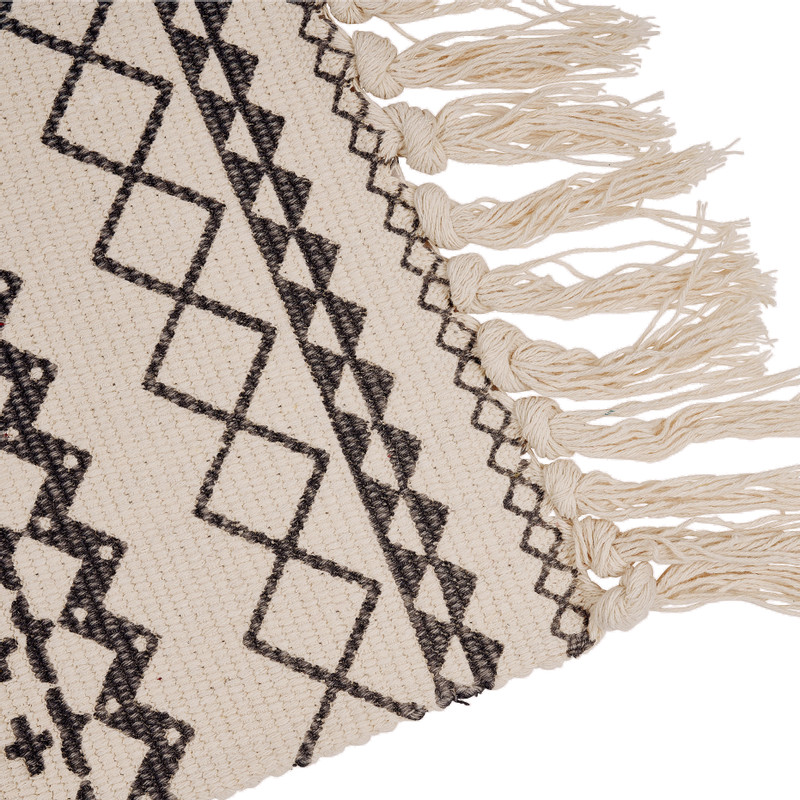 Dit aztec vloerkleed is perfect als badmat! Ook voldoet het kleed prima als sfeervol vloerkleedje voor in de slaapkamer. Leg het bijvoorbeeld neer naast het bed zodat je altijd op een fijn vloerkleed stapt in plaats van een koude vloer! Het vloerkleed is 90x60 cm en voorzien van azteken patroon. Hier en daar zie je verschillende driehoekjes in mooie lijnen. Aan rand zitten franjes, helemaal passend bij de rest van het design. Gemaakt van 50% katoen en 50% polyester.