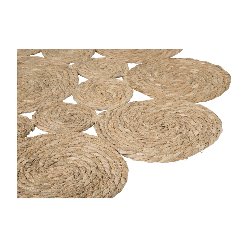 Natuurlijke ronde vloerkleedjes zijn op-en-top trendy. Dit is ook weer zo'n leuk exemplaar! Het vloerkleed is gemaakt van zeegras en bestaat uit diverse bolletjes die samen een bloem vormen. Perfect te gebruiken als vloerkleedje voor naast het bed of als badkamermat!