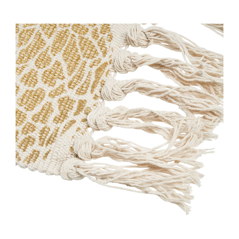 Hoe leuk is dit vloerkleed? Wij zijn er helemaal weg, zeker door de gouden giraffe print met glitters! Het vloerkleed is naturel kleurig en aan beide uiteindes zitten speelse franjes. Het kleedje brengt sfeer in de badkamer of (kinder)slaapkamer. De afmeting is 90x60 cm.