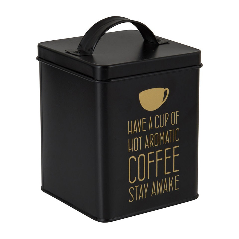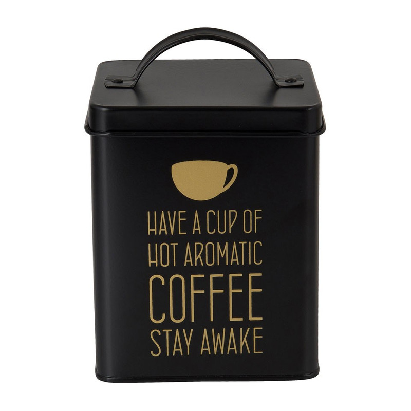 Bewaar jouw koffie in stijl in dit stoere zwarte blik met goudkleurige opdruk. Op het blik staat de tekst 'Have a cup of hot aromatic coffee stay awake'. De afmeting is 11x11x14 cm en deze is gemaakt van staal. Combineer met de andere blikken uit deze serie om er een mooi geheel van te maken.